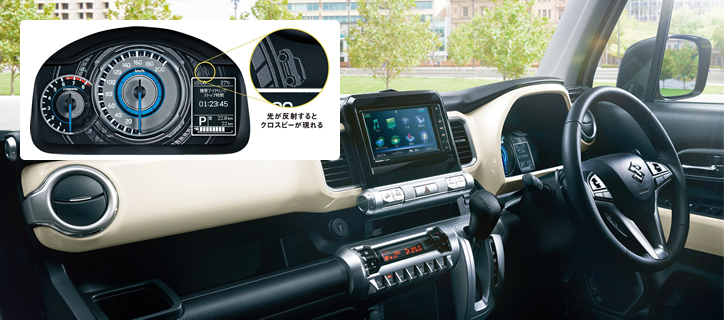 遊び心満載のメーター。上質さを感じさせるクロスビーのインストルメントパネル。光が射し込むとクロスビーが現れる仕掛けや、アニメーションを採用するなど、視覚的にも楽しく、どこかへ出かけたくなる気持ちを後押しします。