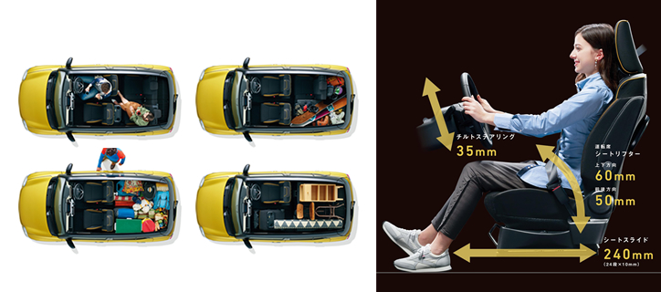 大人5人がしっかり乗れる室内空間で、ヒップポイントが高く、見晴らしの良い前席です。シートスライドは240mm、チルトステアリングは35mmの可動域により最適なドライビングポジションの設定を行うことができます。乗り心地を徹底追及したシートで、前席はシートヒーターが全車標準装備。リアは165mmのスライドが可能。ゆったり座れる後席を実現しました。後席は左右独立スライドとリクライニングなので、多彩なシートアレンジにより荷物の大きさに合わせて利用できます。このクルマなら、行きたいところに連れていってくれる